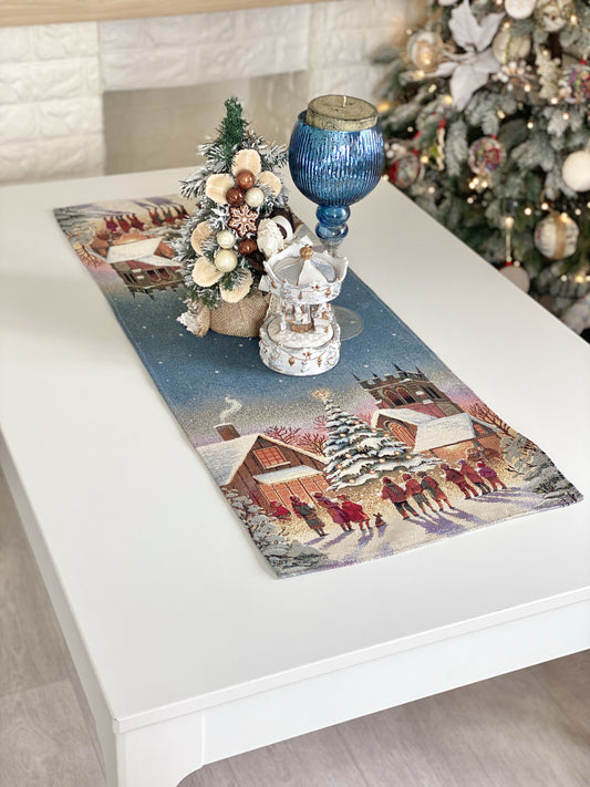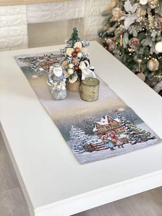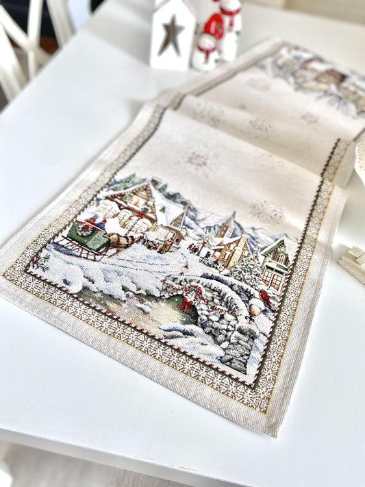 Christmas Tapestry Table runner «Snow village» With microfibre & silver lurex