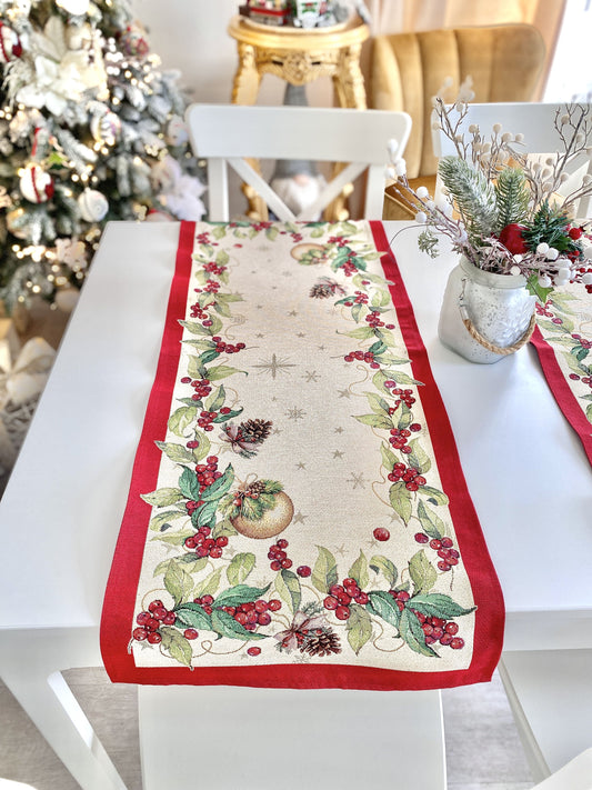 Christmas Table Runner «Holly & Ivy Charm» with Silver Lurex - Luxury Tapestry