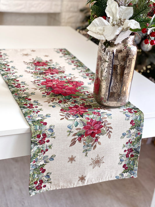 Christmas Table Runner «Red Poinsettia» with Golden Lurex - Luxury Tapestry
