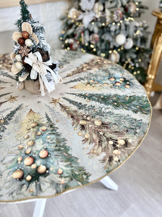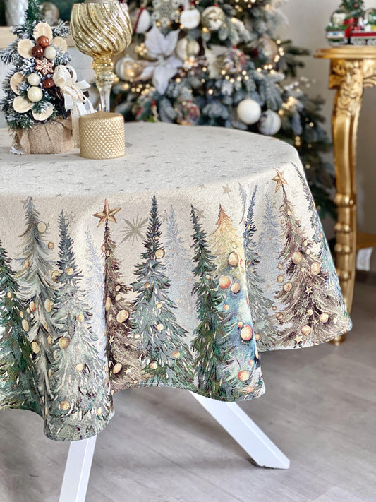 Christmas Round Tablecloth «Evergreen Magic» with Golden Lurex - Luxury Tapestry