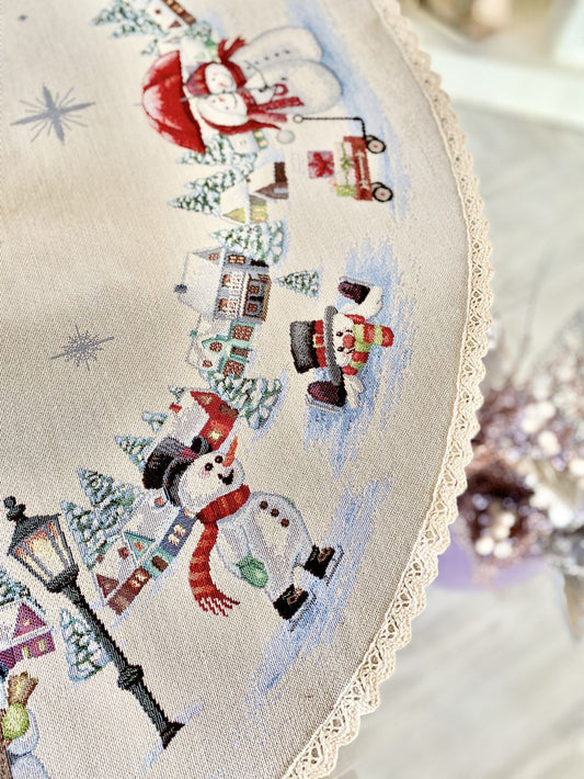 Round Christmas tapestry tablecloth «Snow family» with silver thread
