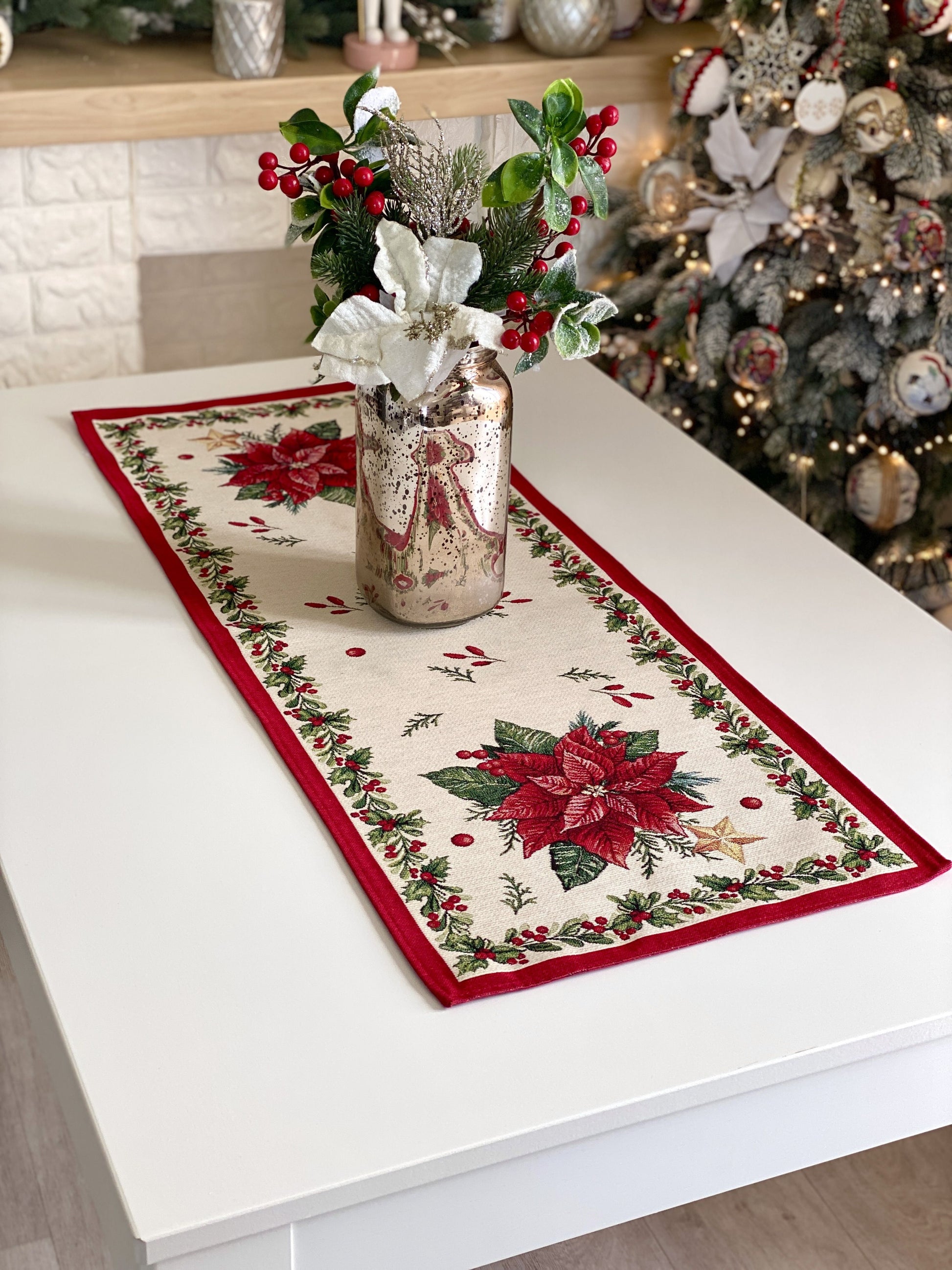 Add festive charm to your holiday décor with our Christmas table runner, woven with gold lurex thread. Decorated with traditional red poinsettias, holly, berries, and golden stars, this runner turns your dining table, sideboard, or coffee table into a Christmas masterpiece.