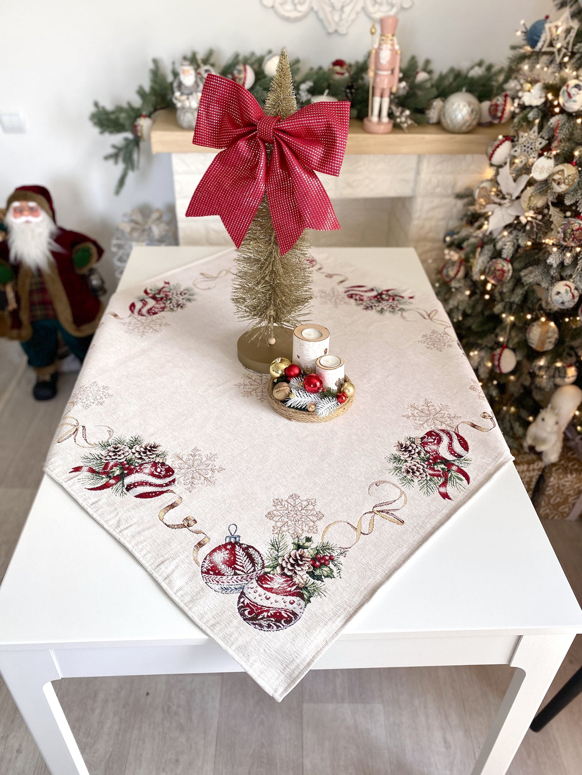 Elevate your festive dining experience with this luxurious Christmas tapestry tablecloth. Crafted from high-quality tapestry with a velvety microfiber blend, it feels soft and smooth like velour while remaining durable for everyday use. Golden lurex threads add a subtle shimmer, beautifully highlighting the festive design of golden snowflakes and bright red ornaments. Perfect for Christmas dinners, family gatherings, or as the centerpiece of your holiday décor.