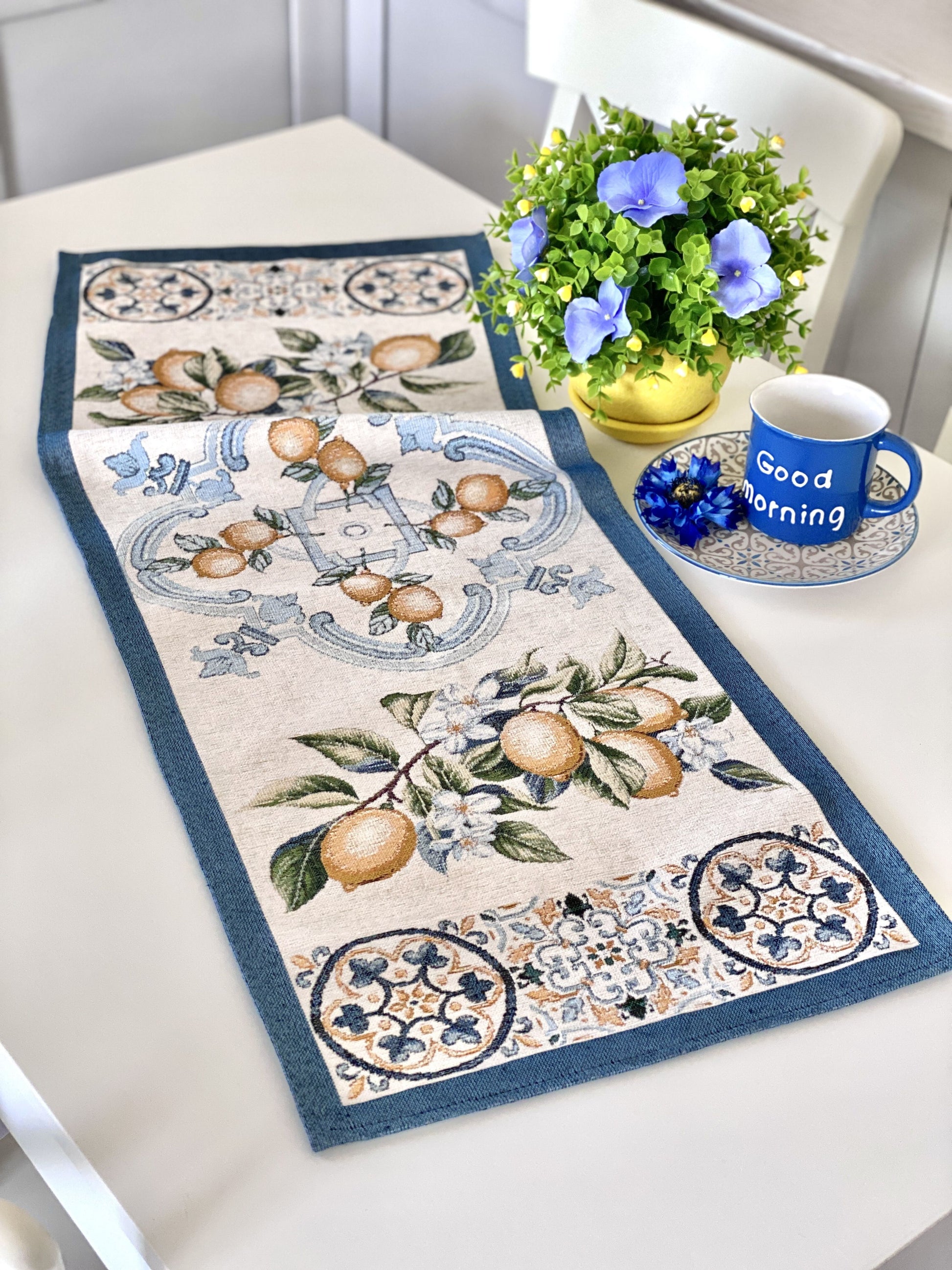Tapestry table runner "Lemon Majolica" with microfibre