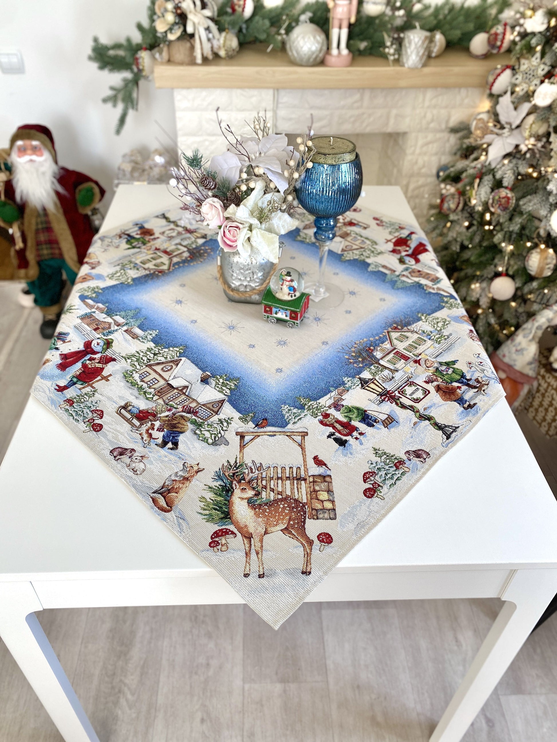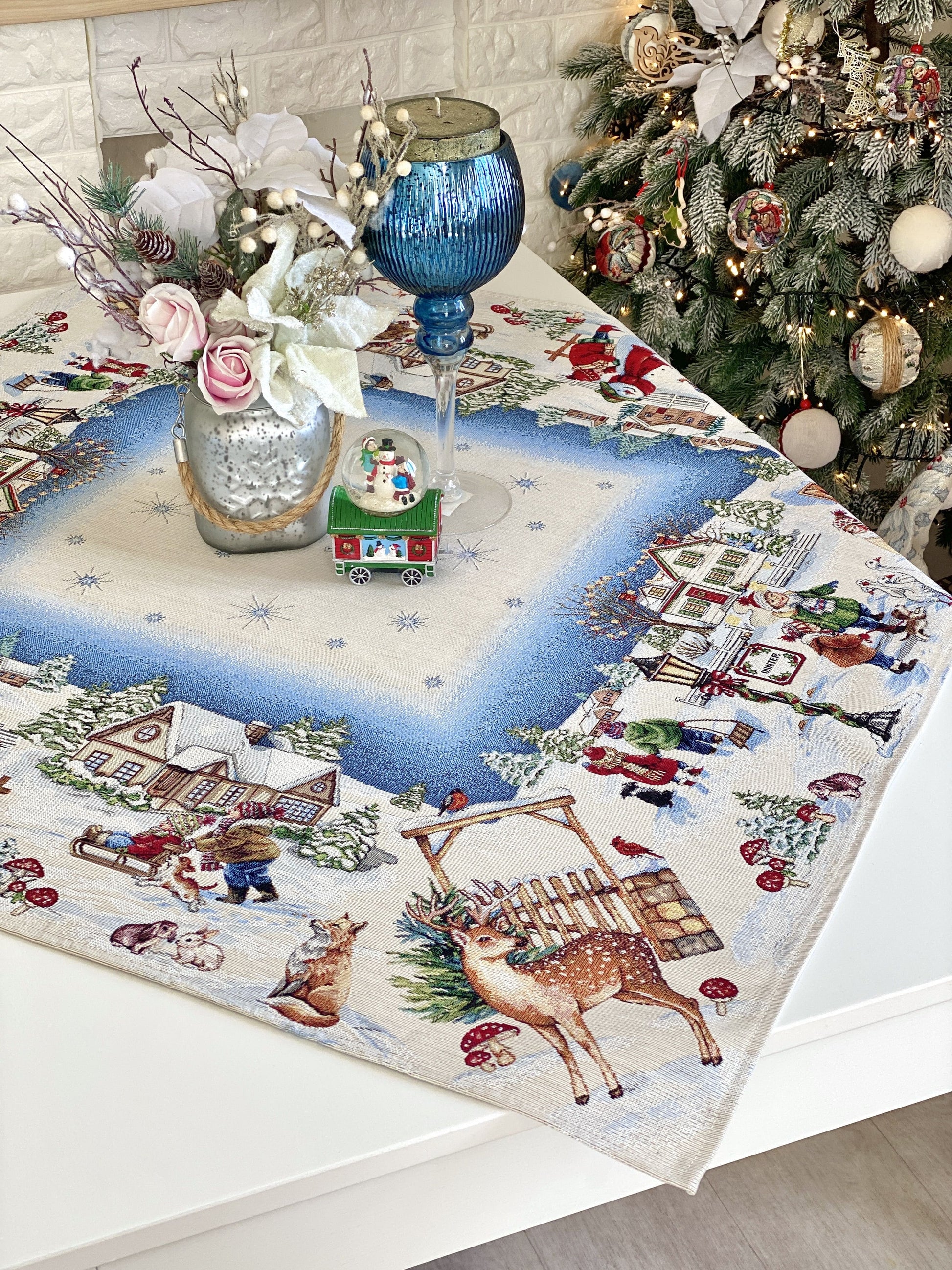Transform your dining table into a festive wonderland with this luxury gobelin Christmas tablecloth featuring a magical winter village design. Adorned with snowy houses, deer, snowmen, and children playing, the shimmering silver lurex threads add elegance to every holiday gathering. Perfect for Christmas dinners, New Year parties, and cozy winter evenings.