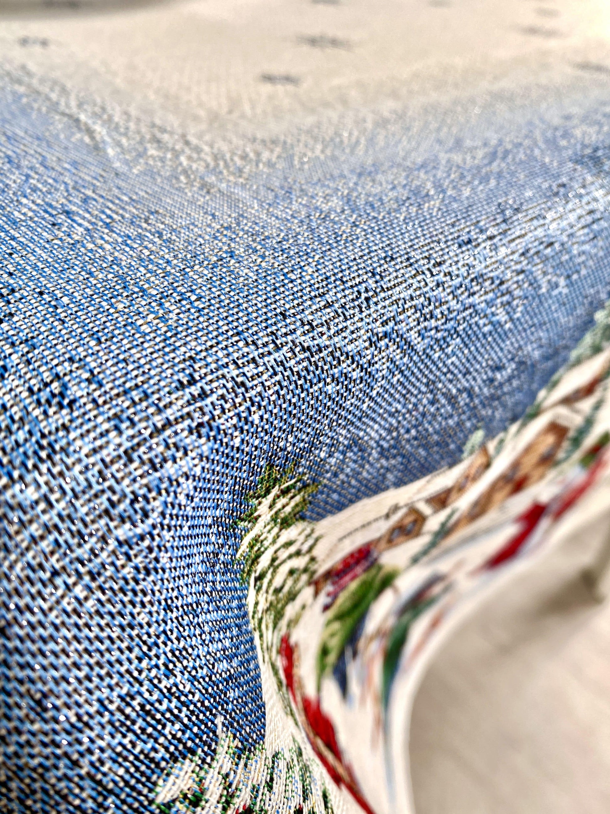 Transform your dining table into a festive wonderland with this luxury gobelin Christmas tablecloth featuring a magical winter village design. Adorned with snowy houses, deer, snowmen, and children playing, the shimmering silver lurex threads add elegance to every holiday gathering. Perfect for Christmas dinners, New Year parties, and cozy winter evenings.