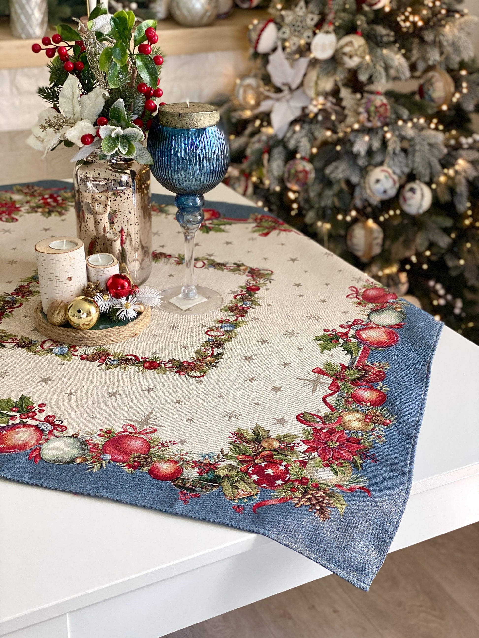 Bring festive elegance to your holiday gatherings with this luxury tapestry Christmas tablecloth woven with golden lurex. Featuring classic ornaments, holly, pinecones, and poinsettias, it adds timeless charm to your dining room. Perfect for Christmas dinner, family gatherings, or as a thoughtful seasonal gift. Durable woven fabric ensures long-lasting use and a touch of sophistication for every festive table setting.