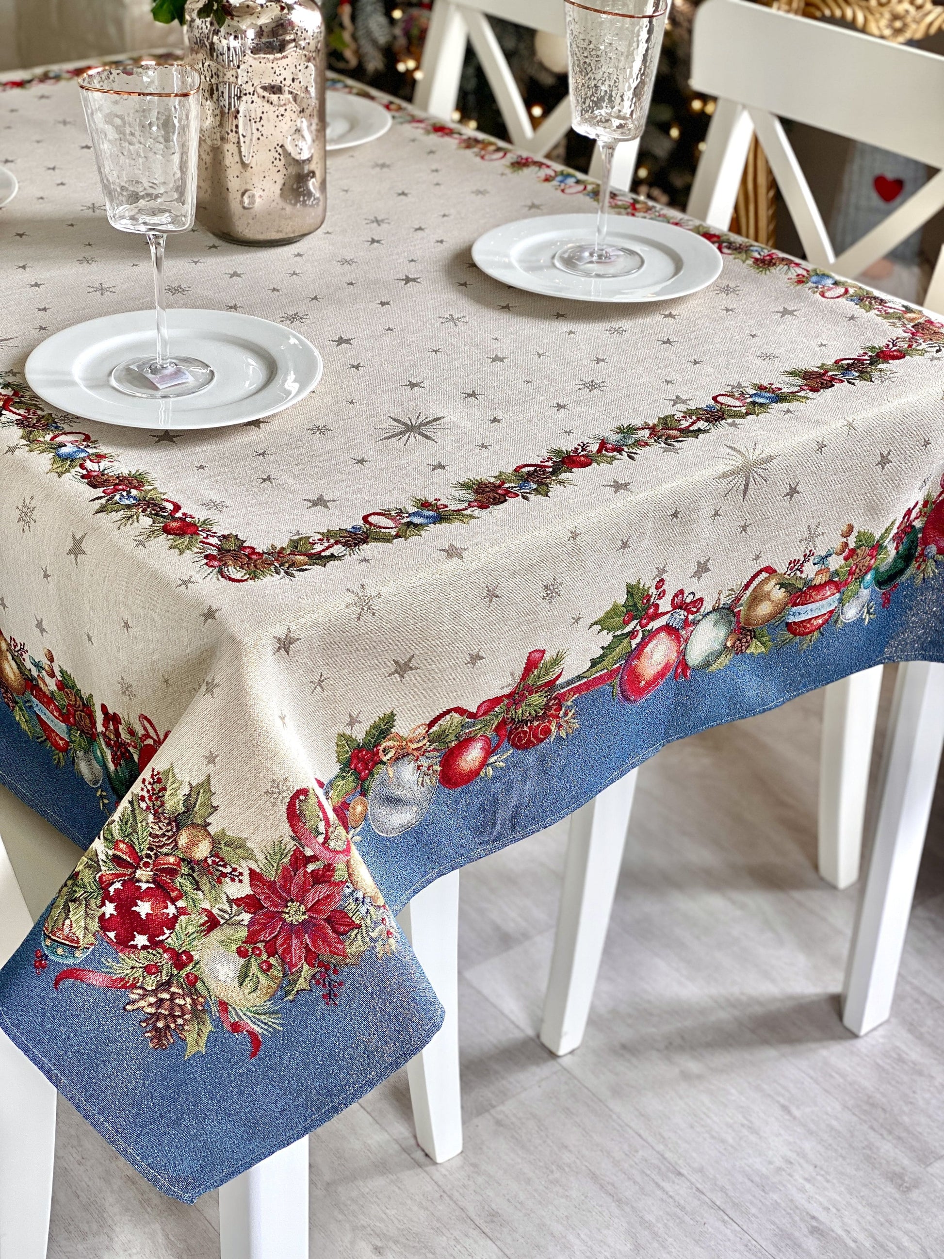Bring festive elegance to your holiday gatherings with this luxury tapestry Christmas tablecloth woven with golden lurex. Featuring classic ornaments, holly, pinecones, and poinsettias, it adds timeless charm to your dining room. Perfect for Christmas dinner, family gatherings, or as a thoughtful seasonal gift. Durable woven fabric ensures long-lasting use and a touch of sophistication for every festive table setting.