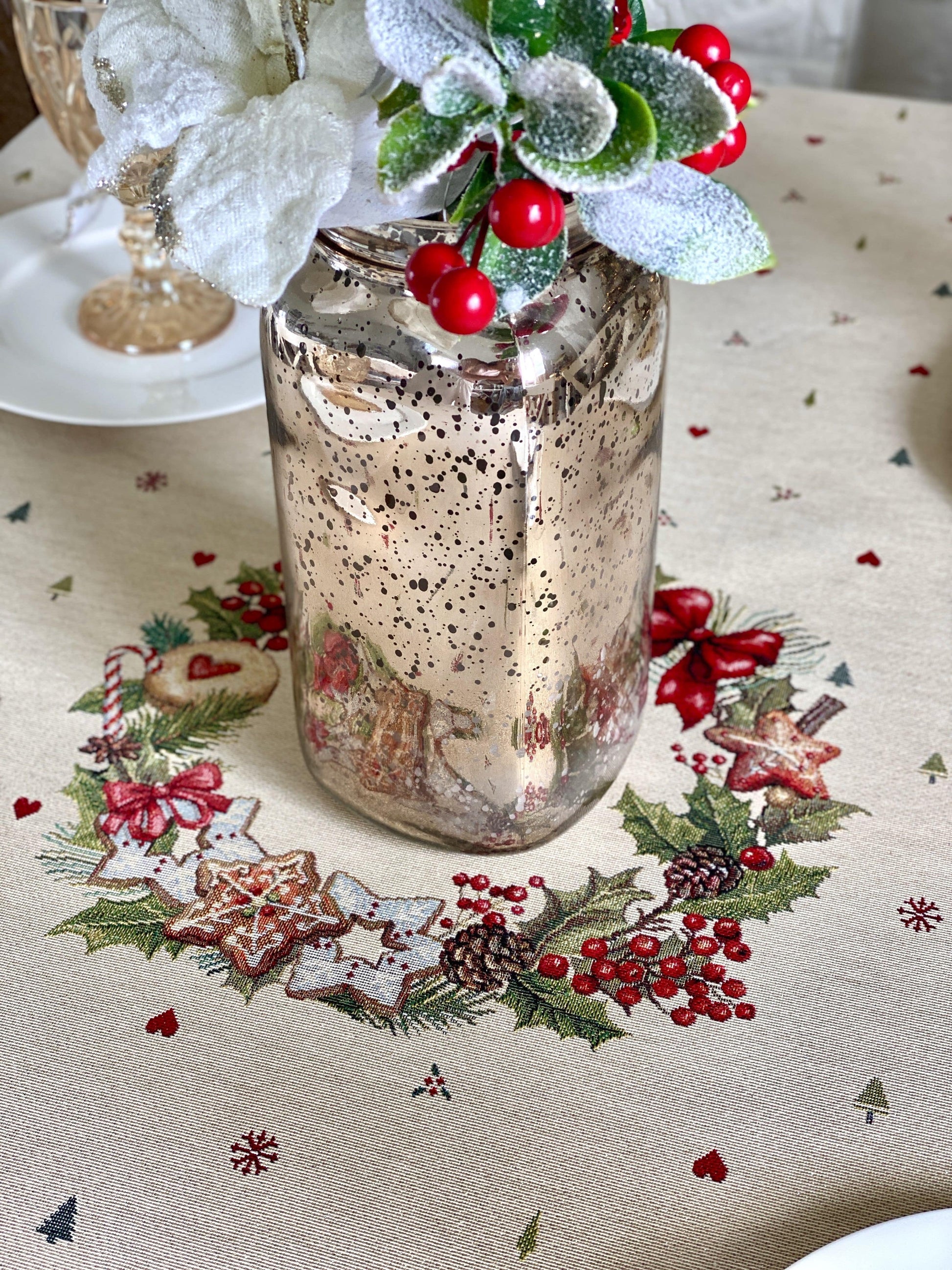Transform your dining table into a festive centerpiece with this Christmas tablecloth. Made from high-quality woven tapestry with shimmering gold lurex, it features a cozy holiday design with cookies, poinsettias, and a classic red plaid border. Perfect for family dinners, Christmas parties, or holiday gatherings, this tablecloth adds warmth, elegance, and a touch of farmhouse charm to your home décor.
