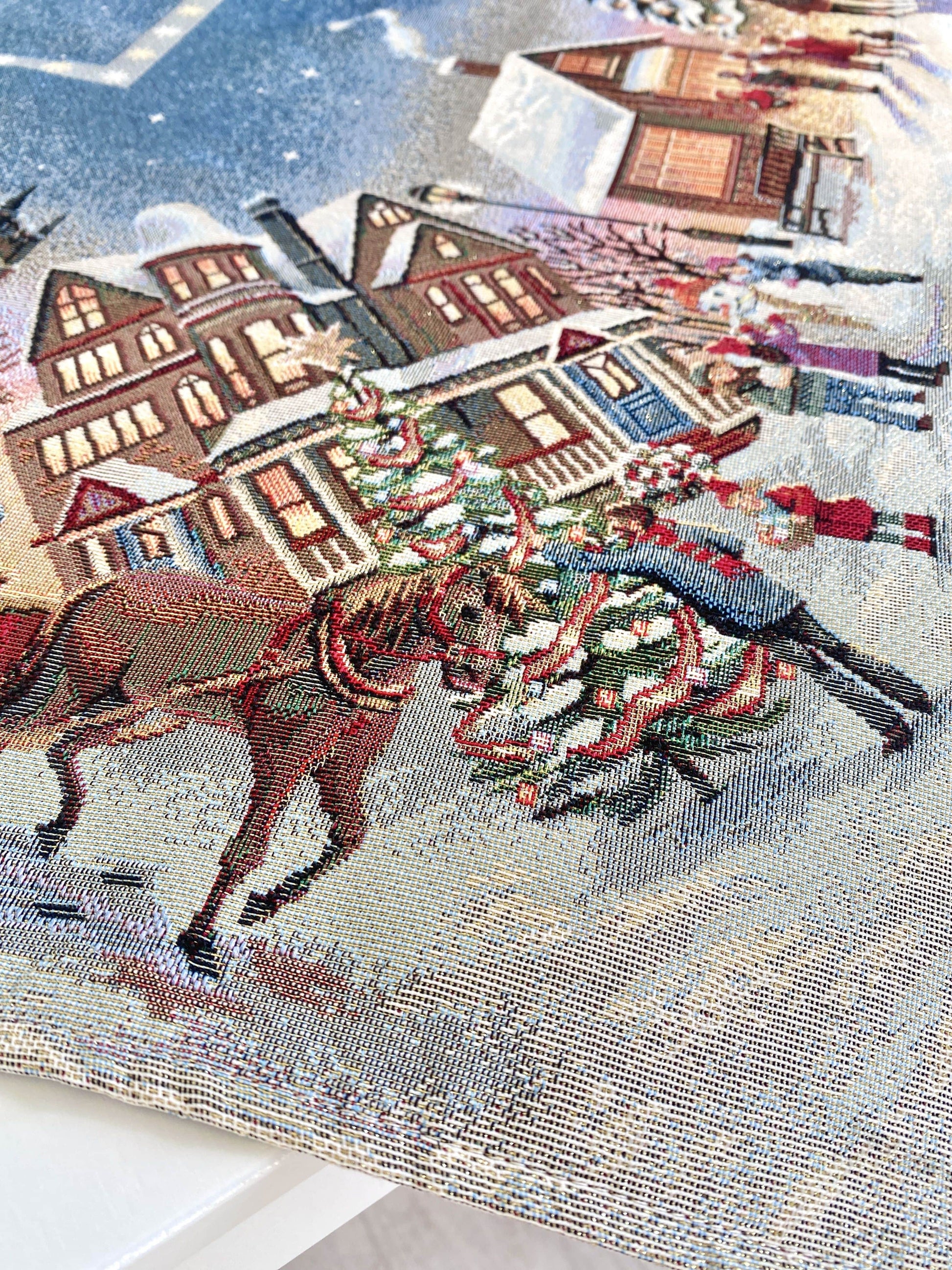 Bring holiday magic to your dining room with this Christmas tablecloth, crafted from high-quality tapestry and enriched with gold lurex threads. The winter village scene, with carolers, snowy houses, and a glowing Christmas tree, creates a warm and nostalgic atmosphere. Perfect for Christmas Eve dinners, family gatherings, or as an eye-catching holiday décor accent.